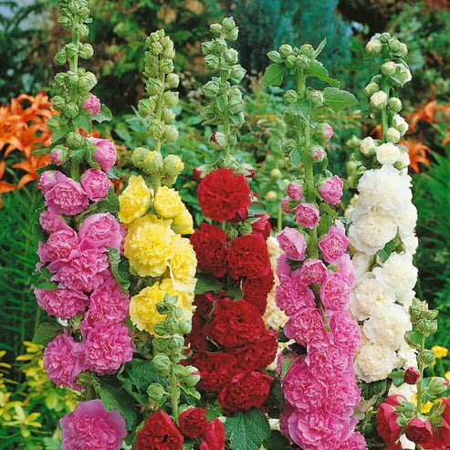For a classic cottage garden look, plant hollyhocks along fences, walls, or the back of flower beds. They also pair beautifully with delphiniums, roses, and lavender.
