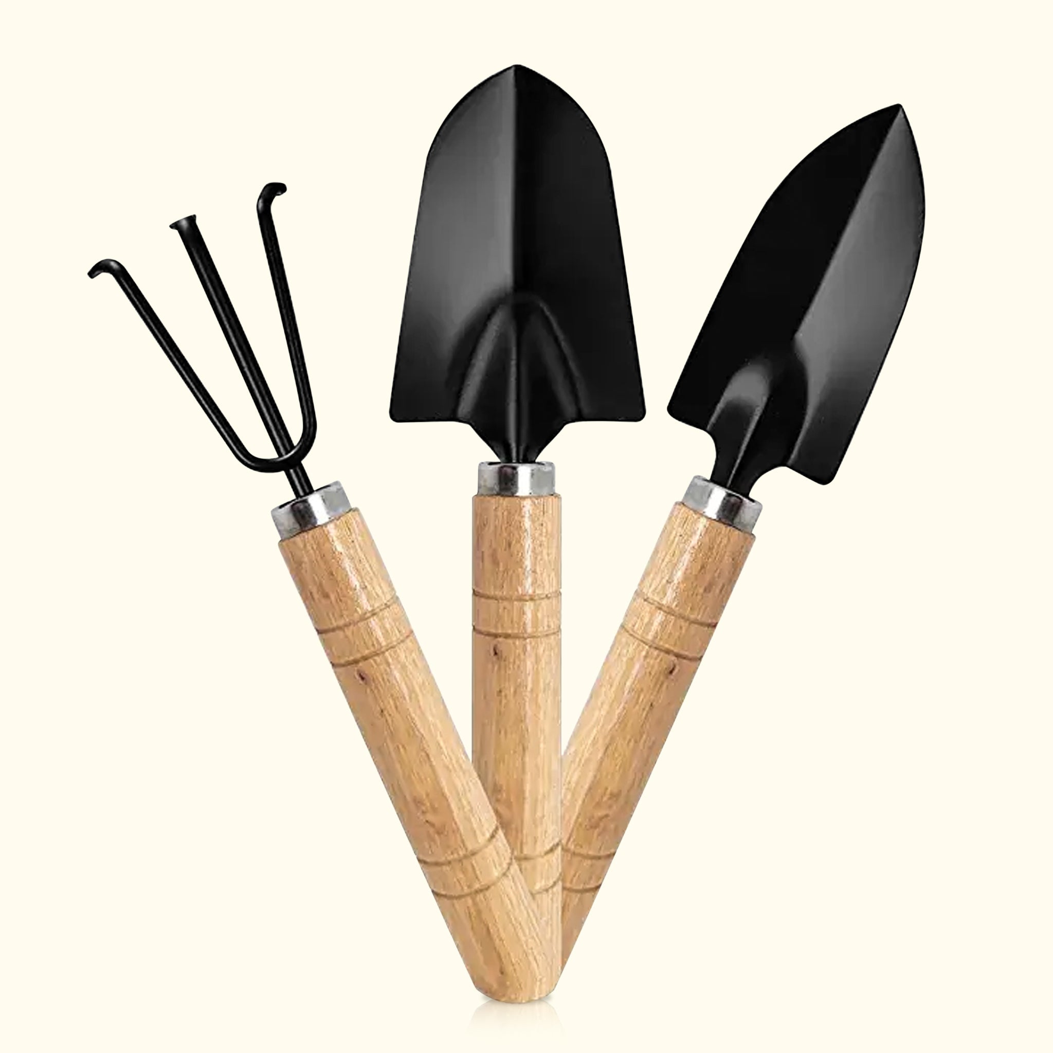 A mini gardening planting toolset of three, including a hand shovel, a transparent shovel, and a cultivator hand rake, can assist in planting, transplanting, weeding, ventilation, loosening the soil, and fertilization. Small size, not only can meet the gardening work can also lead children to experience the fun of gardening.