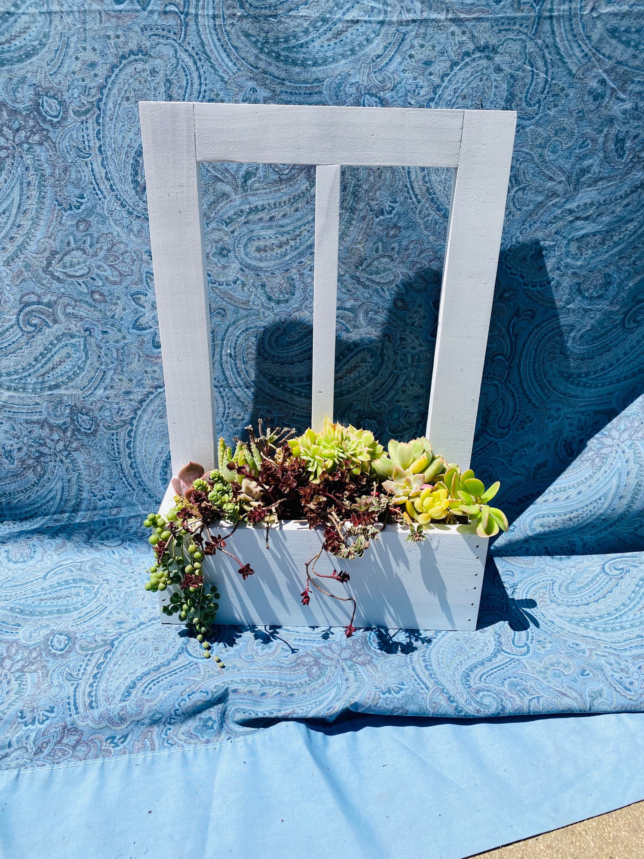 18 x 12 inches 4/5 inch depth planter box large window with window box Solid wood window with window box full of succulents. Window can come preplanted Or you can have them shipped with the window in a seperate container and plant yourself. Succulents included The succulents alone cost $65-90 to purchase the types listed . You are getting a sealed window with a large 5 inch deep window box filled with 11 types of succulents and sedums combined.