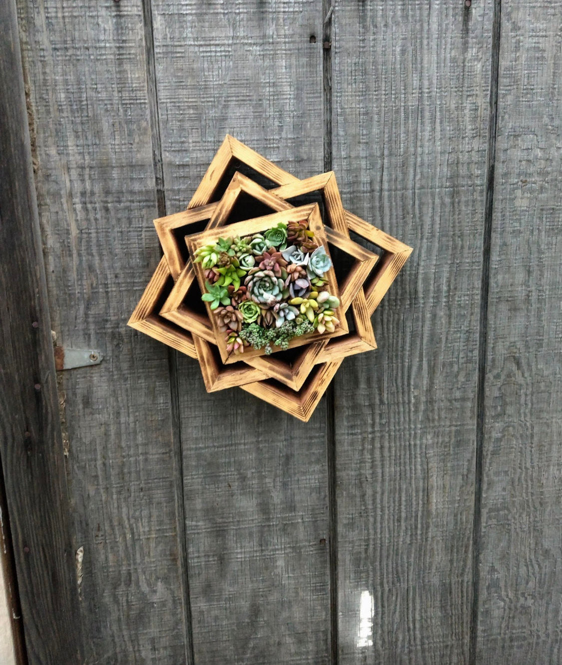 Large solid cedar wood hanging wall geometric planter is perfect for indoors as long as it gets light . And perfect for outdoor areas . To create a stunning piece of art to draw attention to any area. These succulent filled planters come with a minimum of 25 different types of succulents and sedum . Perfect for those who have many and want different types . Or those who are just starting out and want many types. This planter as it grows leaves can be removed to propagate into new plants . Perfect way to maintain the size of the succulents all while gaining new plants every few months will help u start a stunning collection of your own . To buy each type of succulent and sedum would cost you well over $150 or more . You are getting all these types in one arrangement to start your own collection as a beginnier or a advanced succulent collector you will be getting variety and many to cut and propagate with this piece